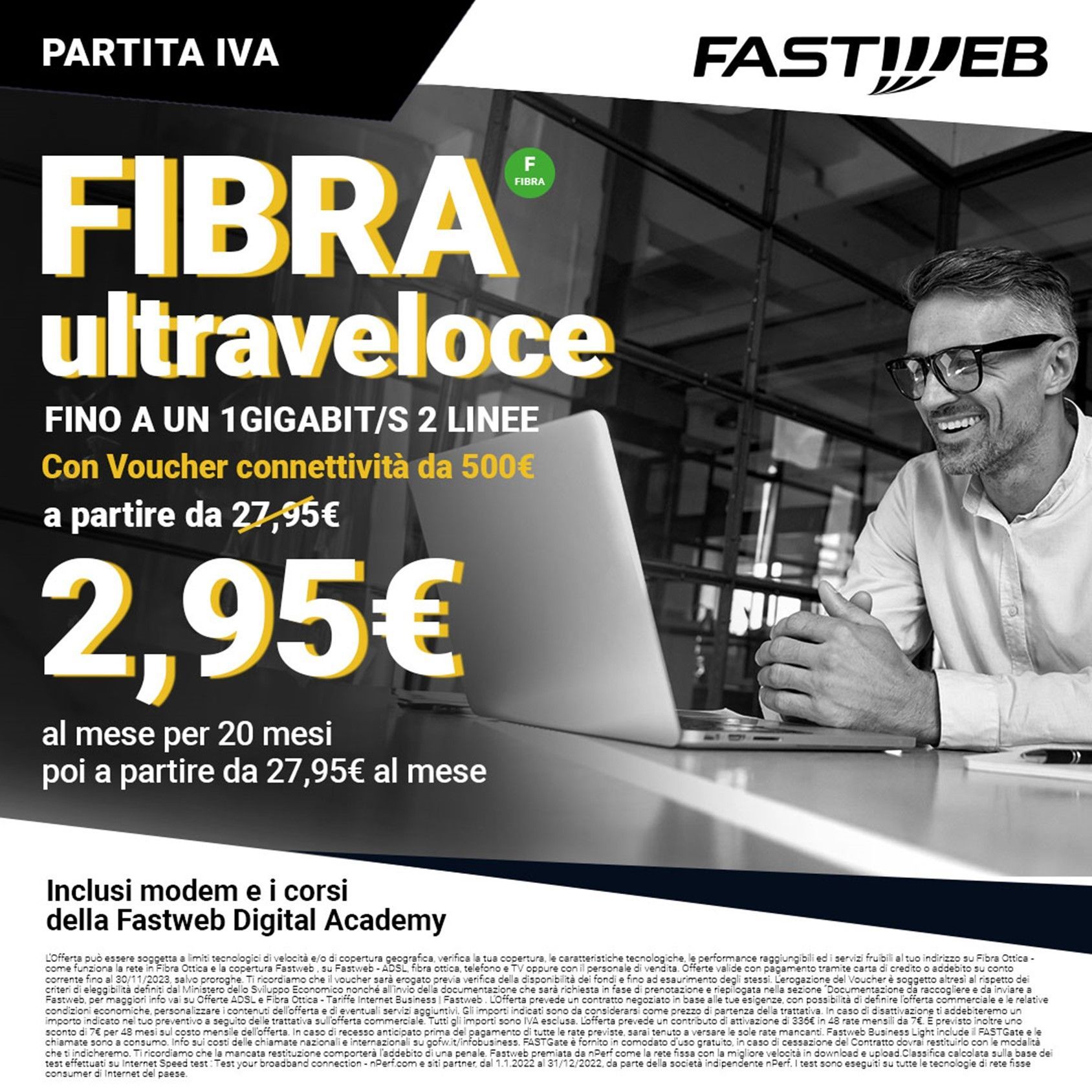 L’offerta ti garantisce fibra fino a 2,5 gigabit/s senza vincoli e senza costi nascosti a 29,95€/mese invece di 34,95€ (prezzo fisso tutto incluso).